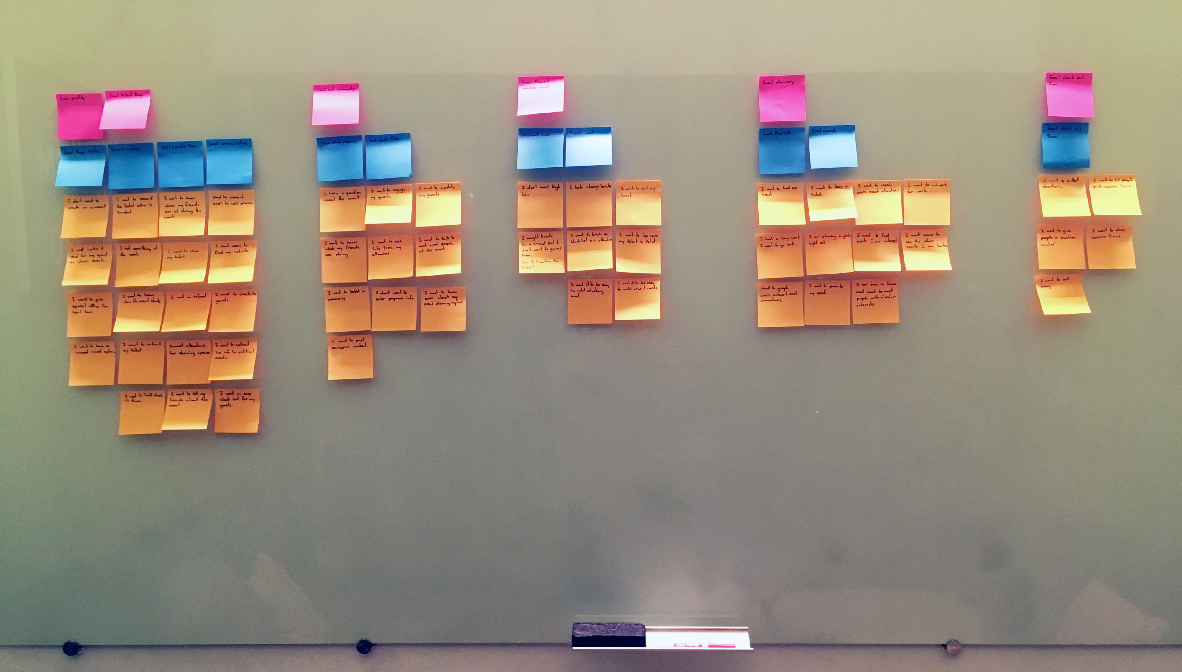 This app has two audiences: event producers and event attendees. I collected "I want to..." statements from event producer requests coming in from our support channels and also conducted some customer interviews. I also wanted to add my own ideas and invent new solutions. All these ideas were collected, sorted, and then categorized to help communicate the requirements for this project to the team as well as collect feedback from the team.