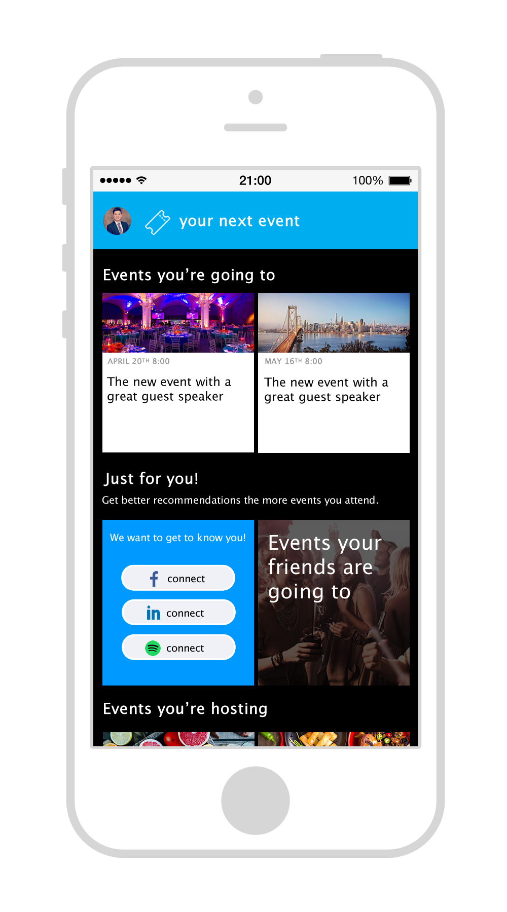 Event playlists is a concept to create playlists of events specific to the user based on their connected profiles. This is the beginning concept for very precise event recommendations. To create a truly valuable end user app. Event playlists would need to include all events, not just Sparxo hosted events. The objective would be to collect event goer data and deliver targeted events as content. This information would make a very powerful event marketing platform. Events created with Sparxo Ticketing could take advantage of this platform.