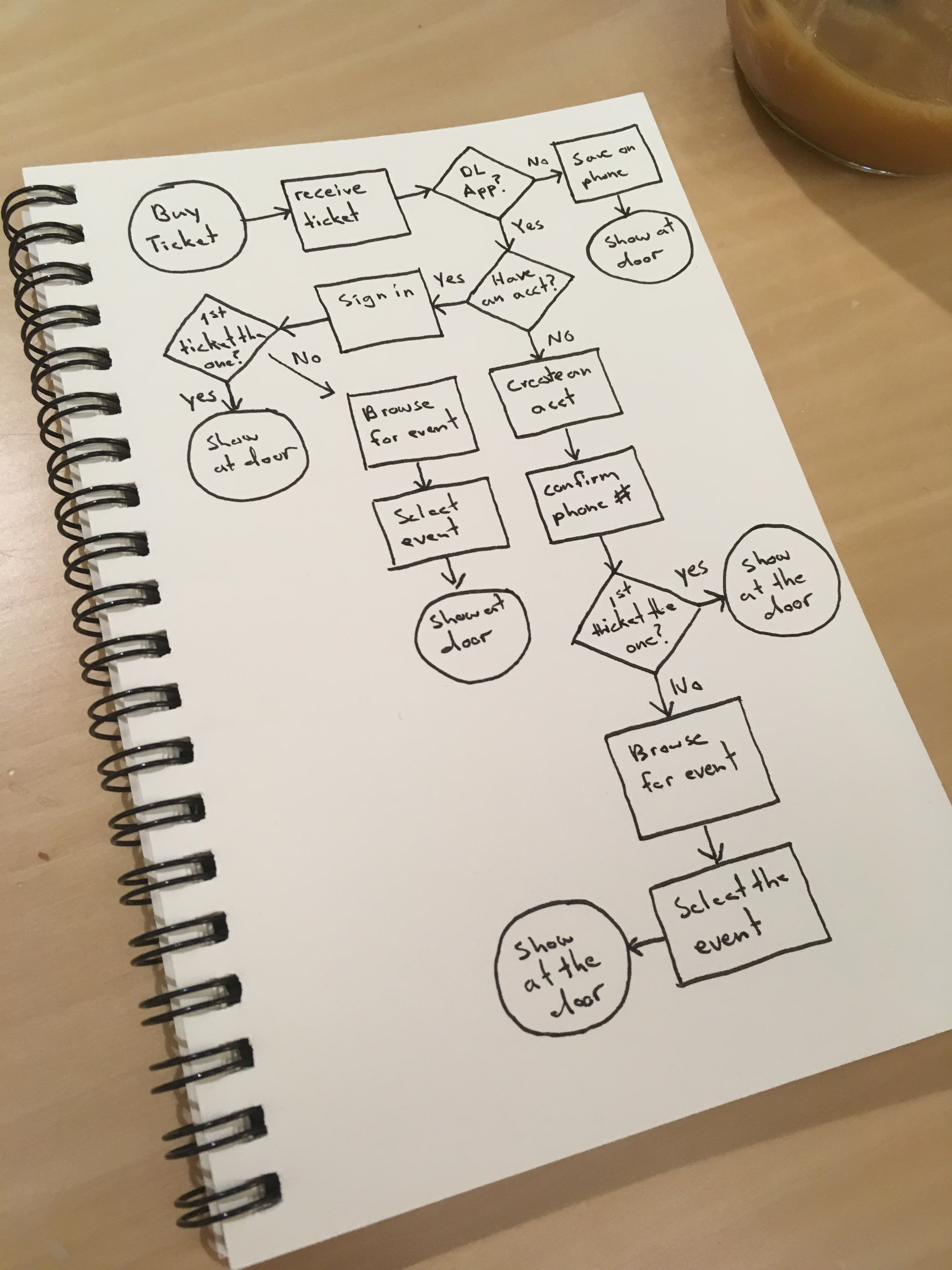 The main goal of this app is to give the user additional experiences in addition to their main goal: 1. Engage each other and the event producer 2. Discover events. The main taskflow to focus on was the ticket retreaval process.