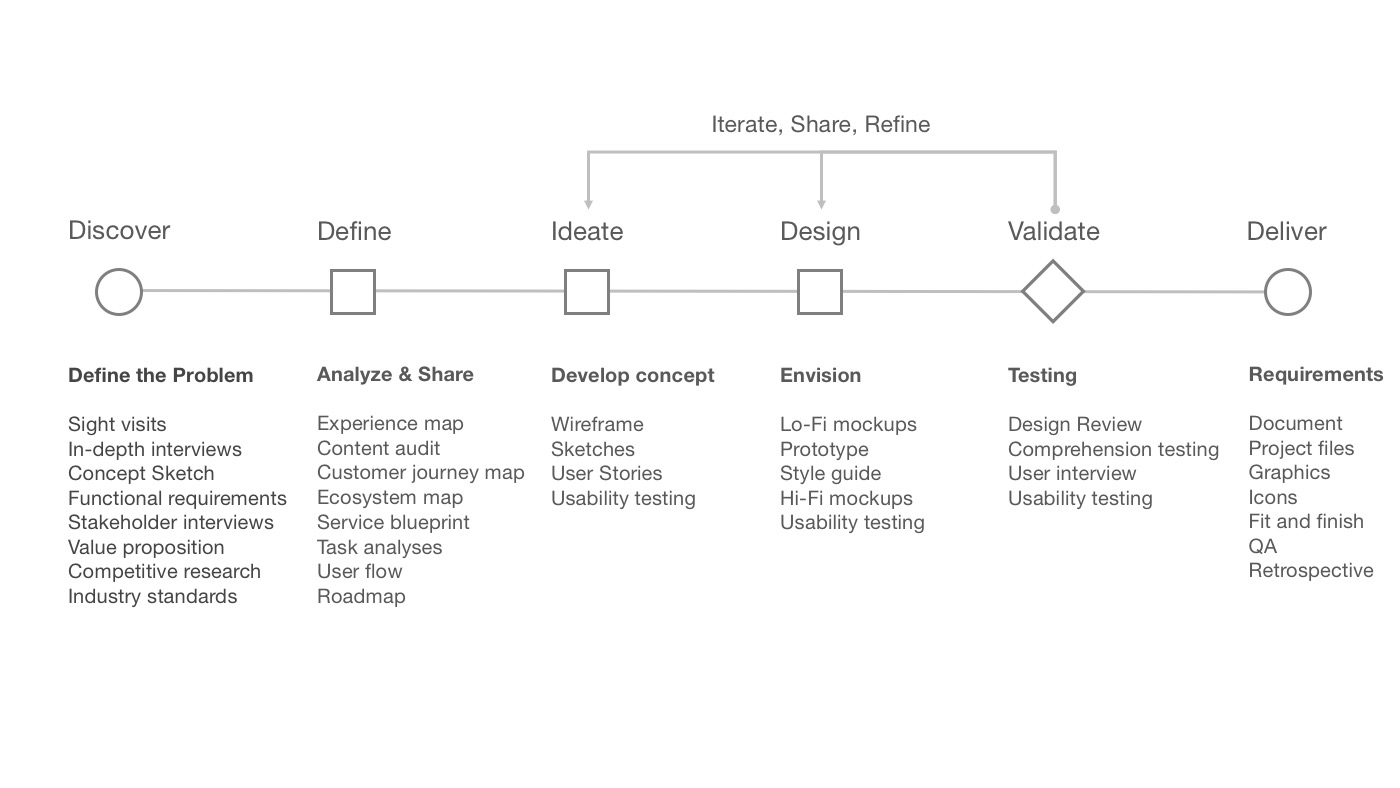 Customer site visits, customer interviews, contexual inquiries, wireframes design, high-fidelity mockups, and user testing.